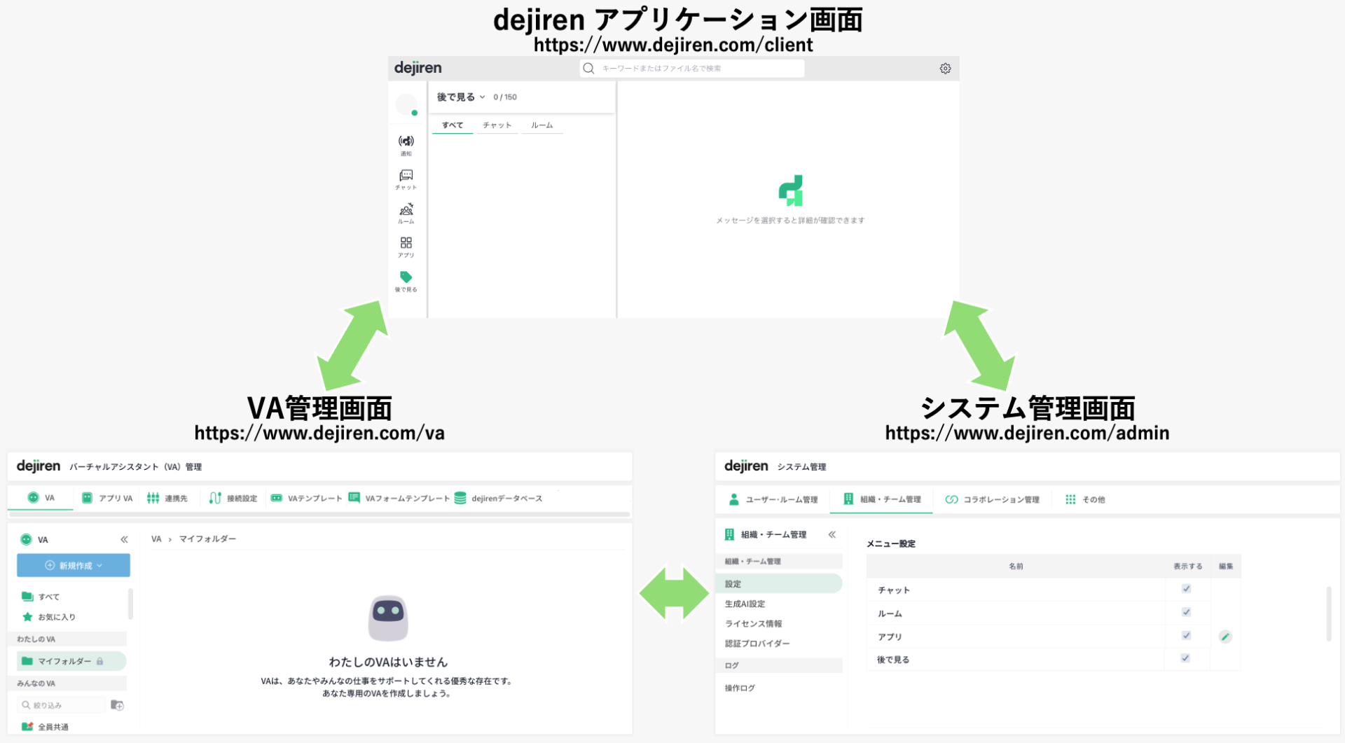 | dejiren アプリケーション画面 (Web/アプリ) https://wp-dev.dejiren.com/client | ・一般にユーザーの方がご利用いただく画面です。 ・個別チャットや、任意メンバーが参加するルームで他のユーザーや VA とのコミュニケーションが可能です。 ・すべてのユーザーが利用可能です (※利用制限設定をしていない場合) |