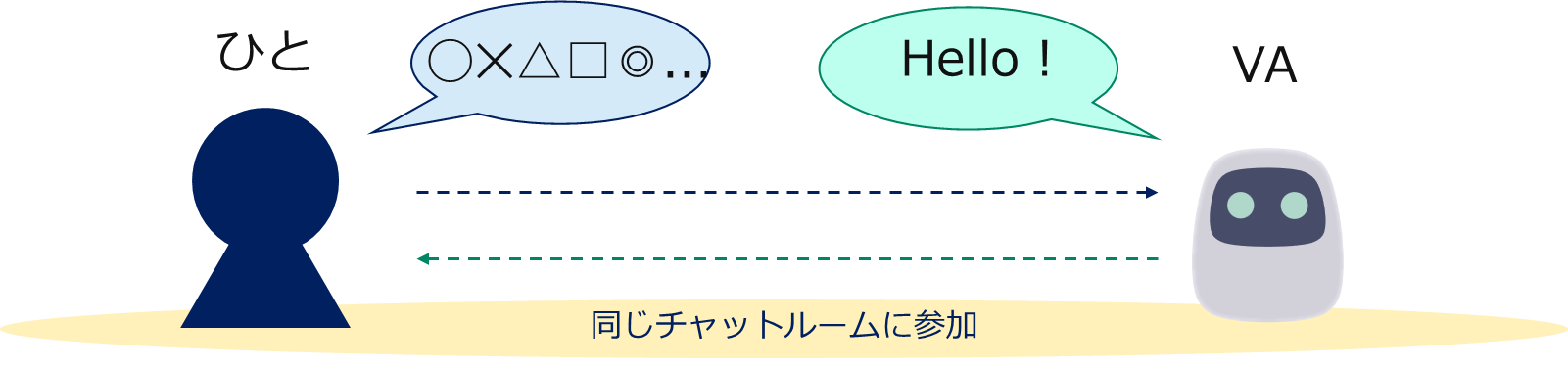 「ユーザーが投稿したメッセージをきっかけにバーチャルアシスタント(VA)を呼び出し、VA がユーザーに応答する」