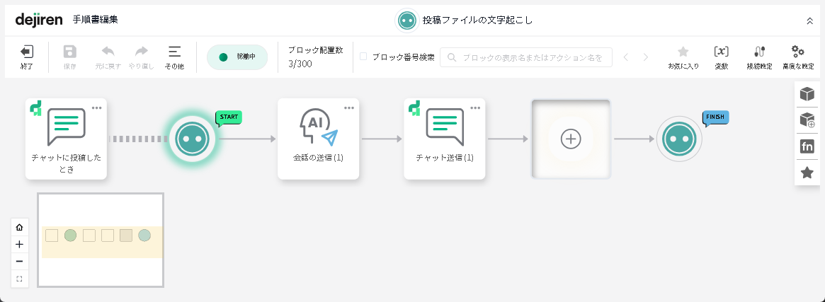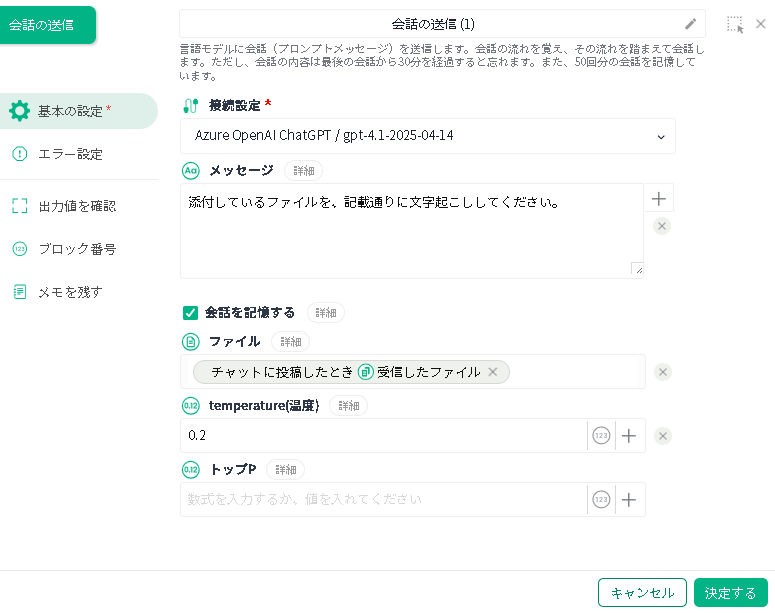 生成 AI への「会話の送信」ブロックで、添付しているファイルの文字起こしが可能です。