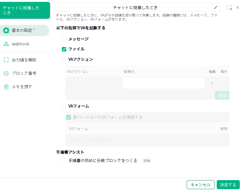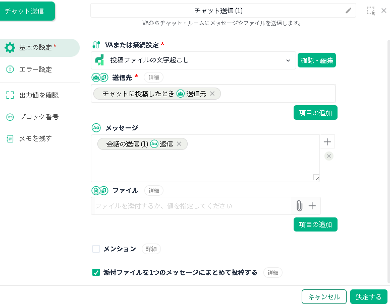 「ファイル」で「+」をクリックし「チャットに投稿したとき − 受信したファイル」を指定します。