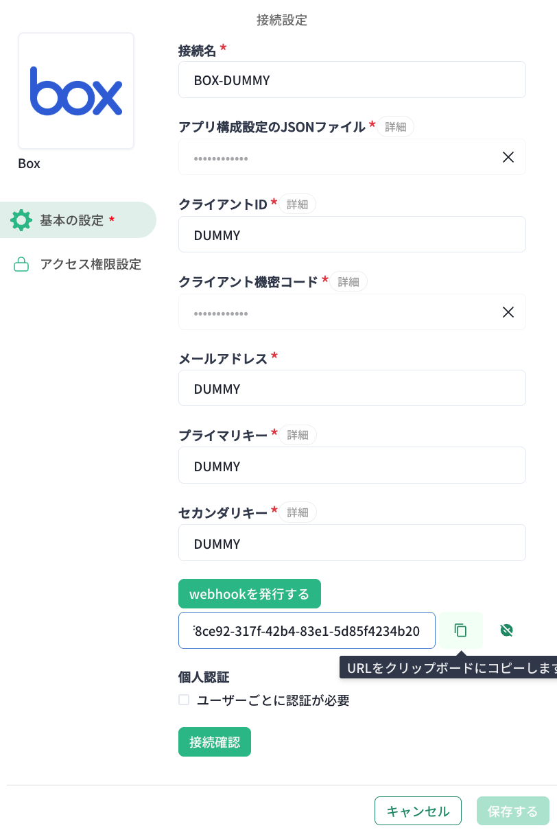 まだ Box との接続設定を作成されていない場合には、こちらのページの記載内容をご参照いただき、