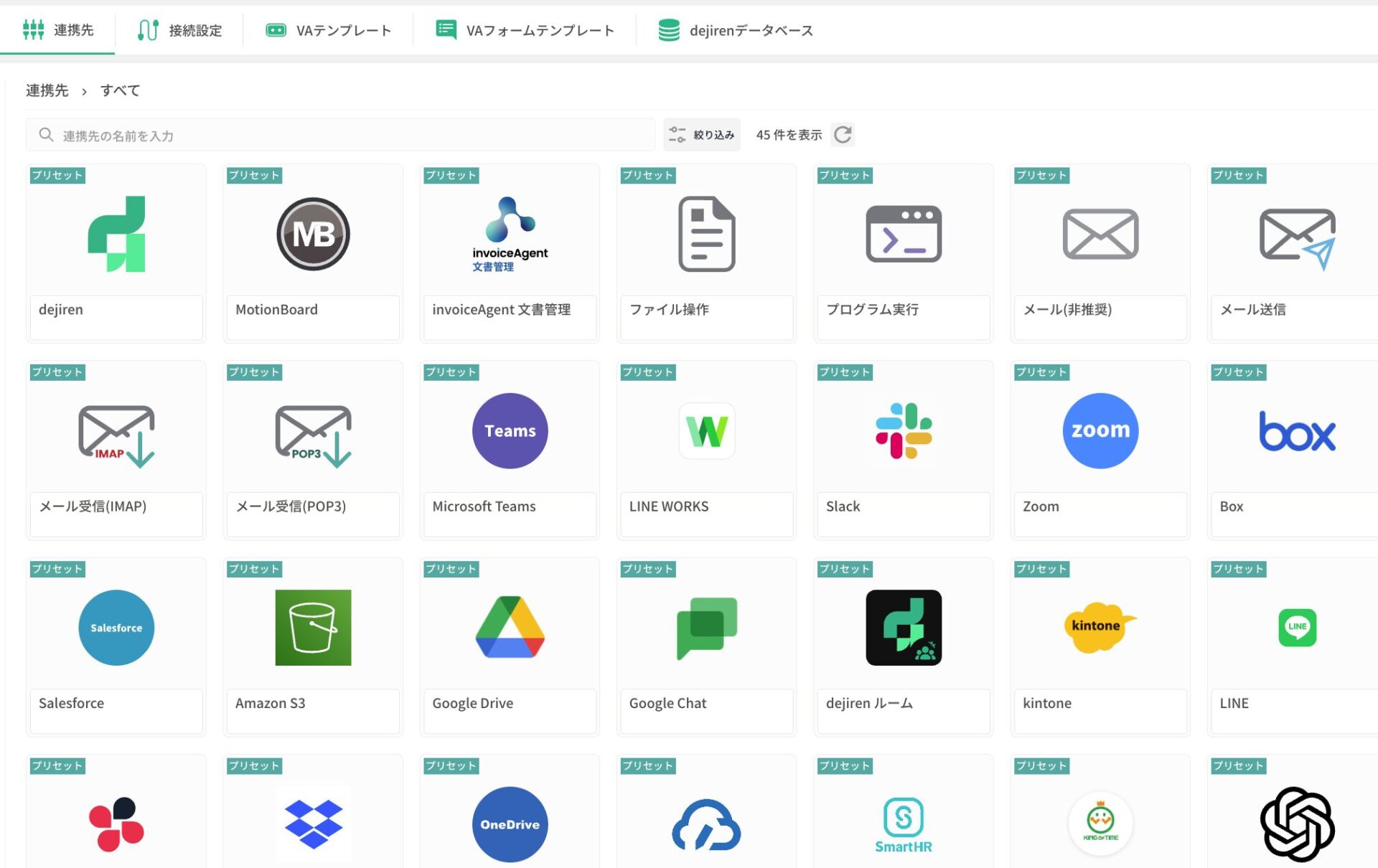 dejiren が接続できる先として、専用のコネクタを介して連携できるものと、
