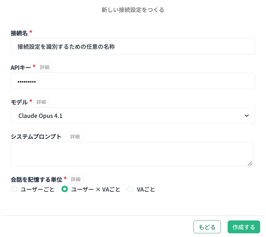 | 会話を記憶する単位 | 生成 AI が会話を記憶する際の単位を指定します。 | 必須 |