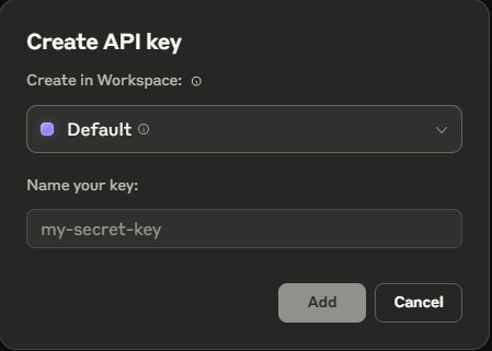 ワークスペースを選択し、APIキーの名前に任意の文字列を入力して [ Add ] をクリックします。