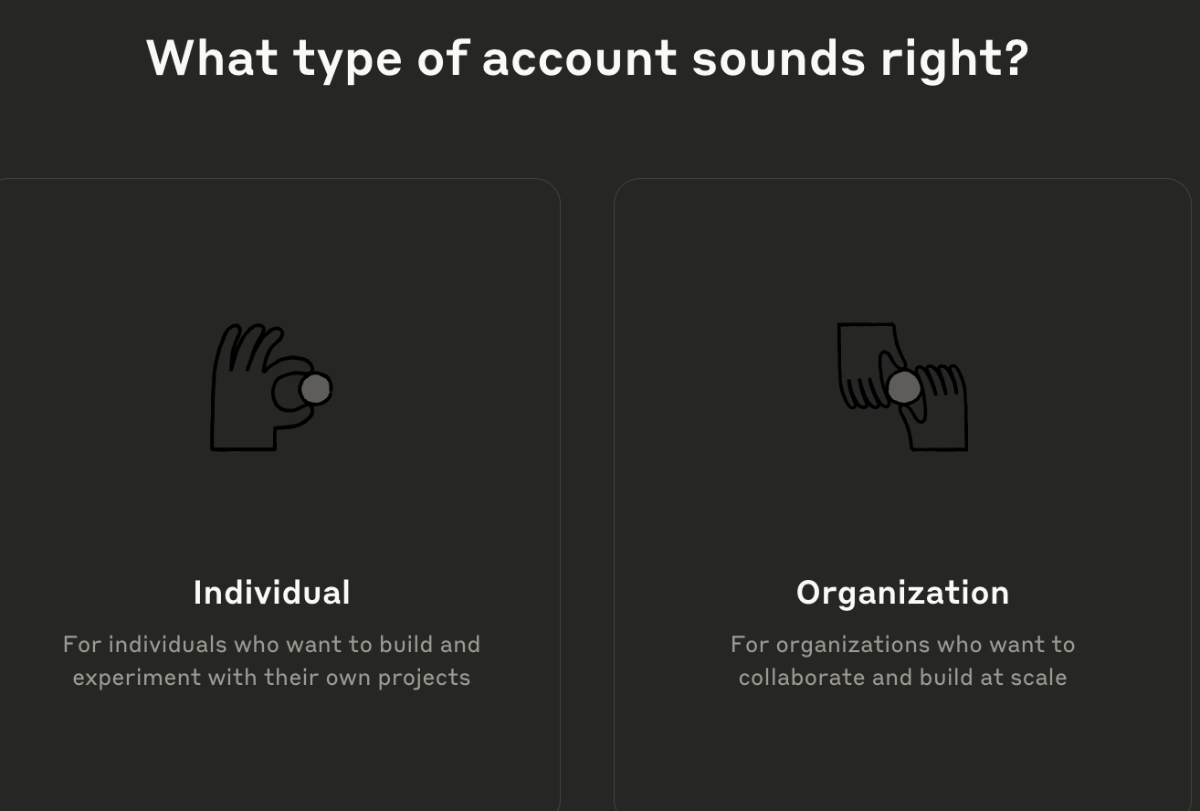 What type of account sounds right? で、用途によりIndividual か Organization を選択します。
