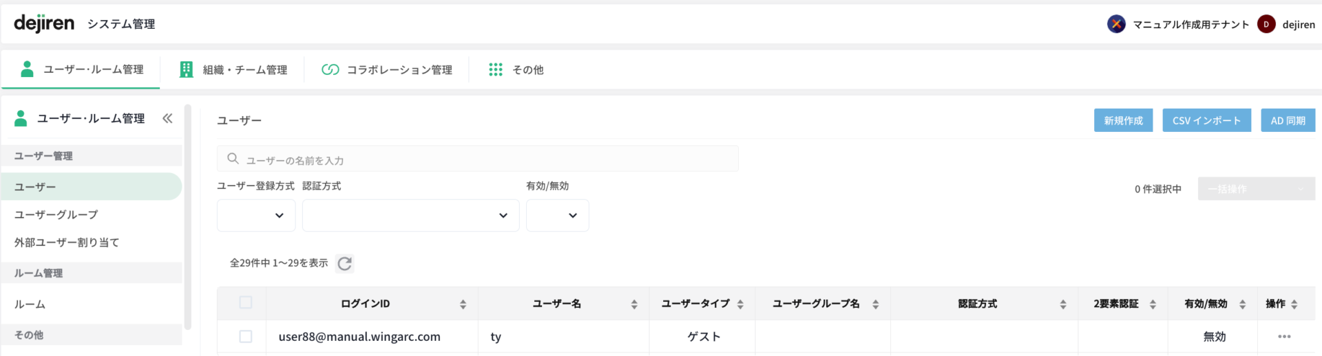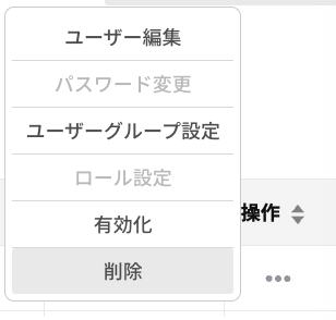 2. ユーザー・ルーム管理 > ユーザー画面で、削除対象アカウントの「操作 (…)」をクリックし、