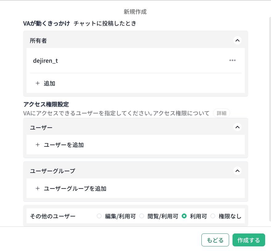 5. この VA の利用を許可するユーザーを設定して、 作成する をクリックします。