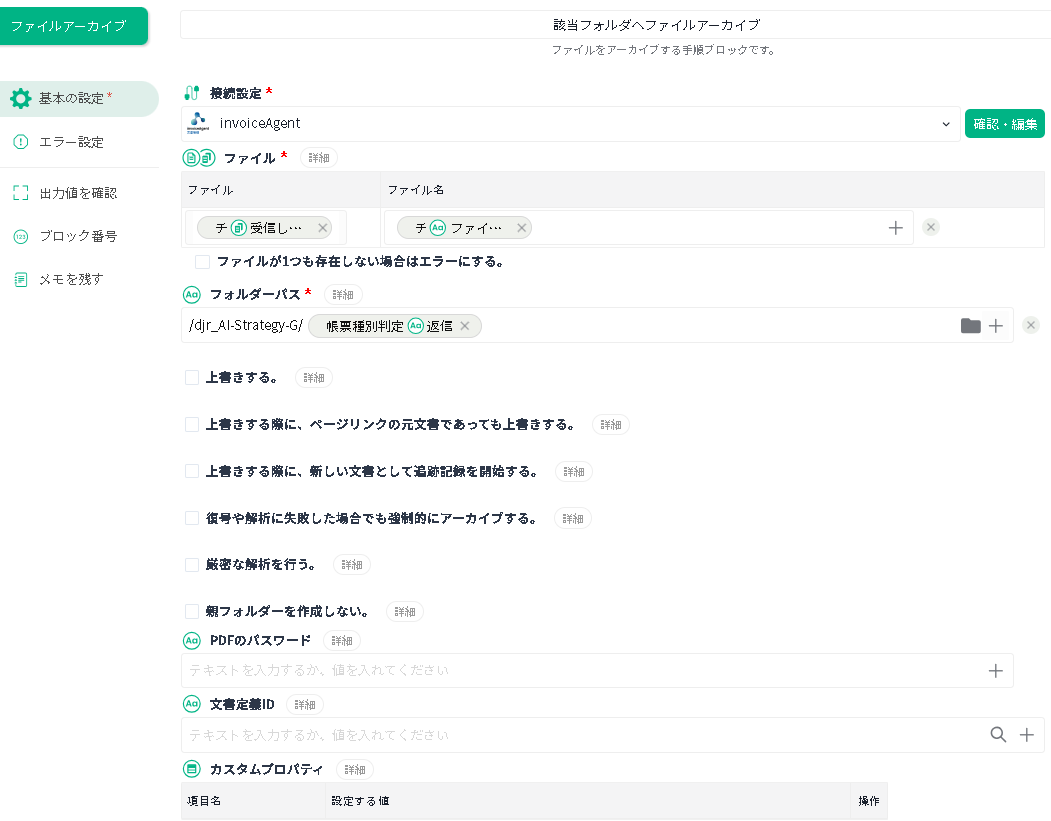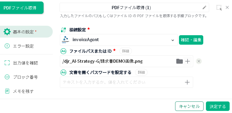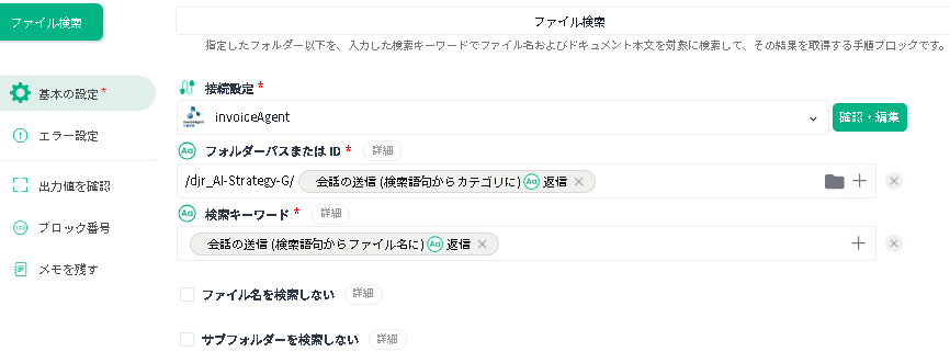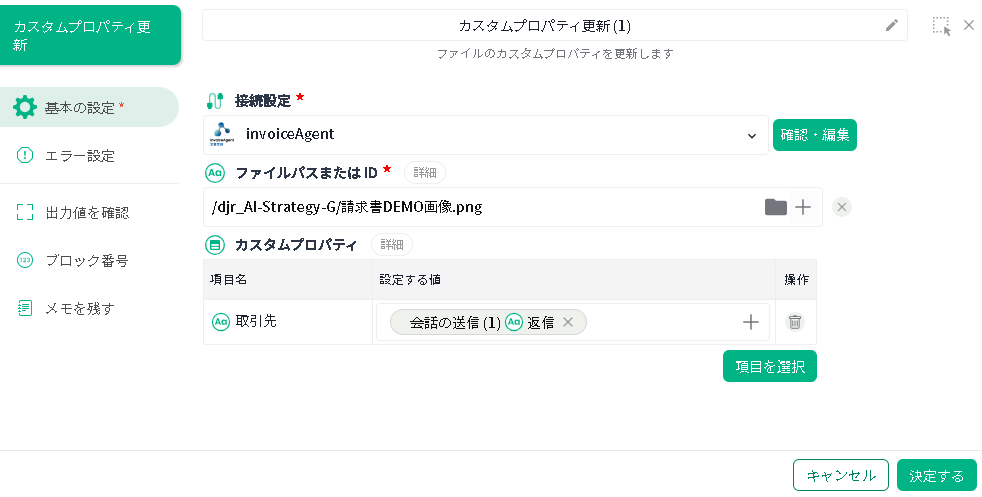 | 接続設定 | 作成済みの invoiceAgent 接続設定を選択します。 | 先の「ファイルプレビュー」ブロックで選択した接続設定が指定されている状態です。 |