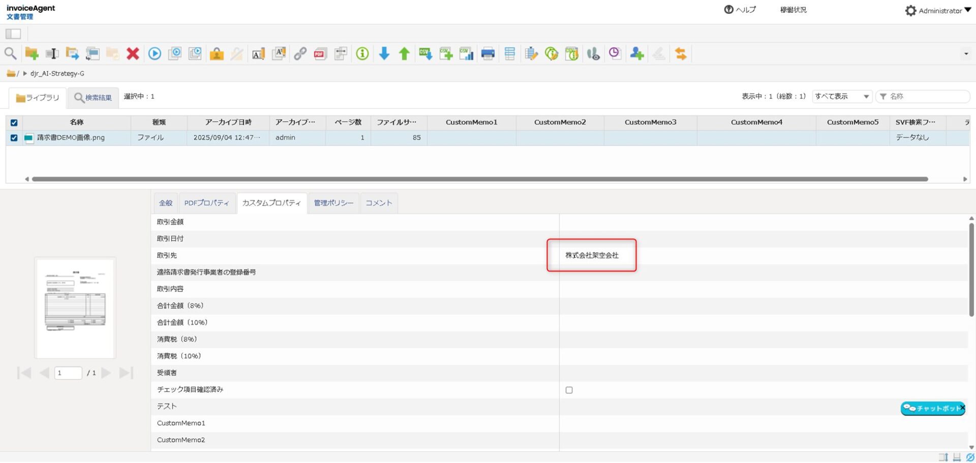④ invoiceAgent のファイルの「取引先」に、生成 AI が抽出した情報が追記されました。