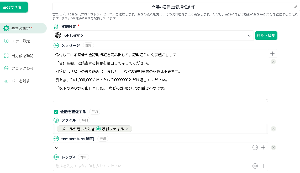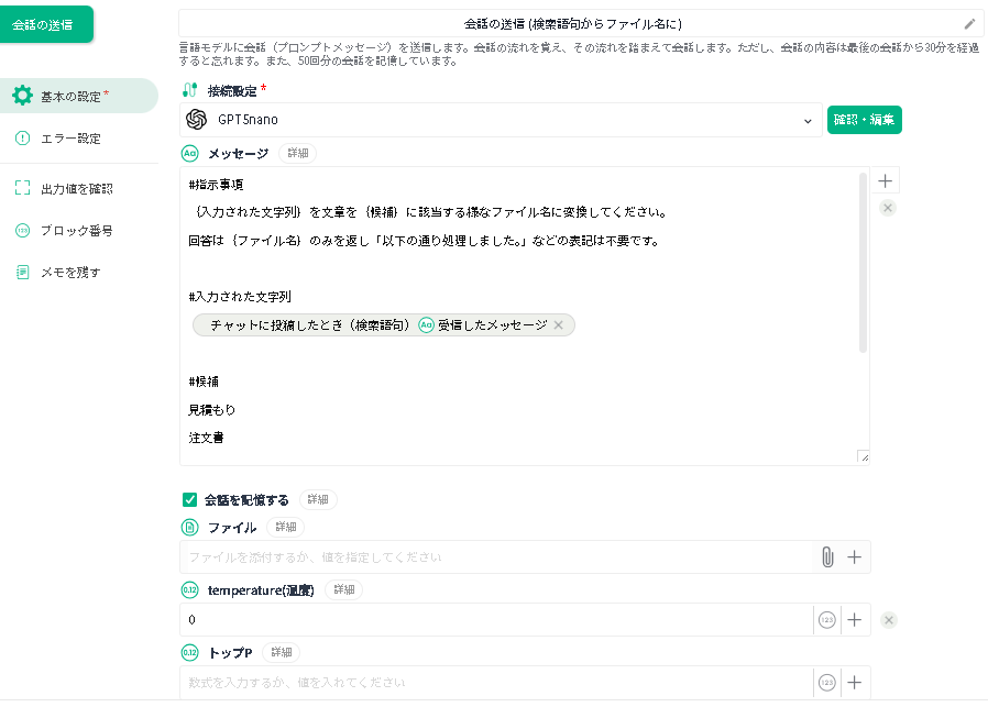 | ファイル | 「PDFファイル取得」で取得したファイルを指定します。 | このファイルが生成AIが解析する対象です。 |