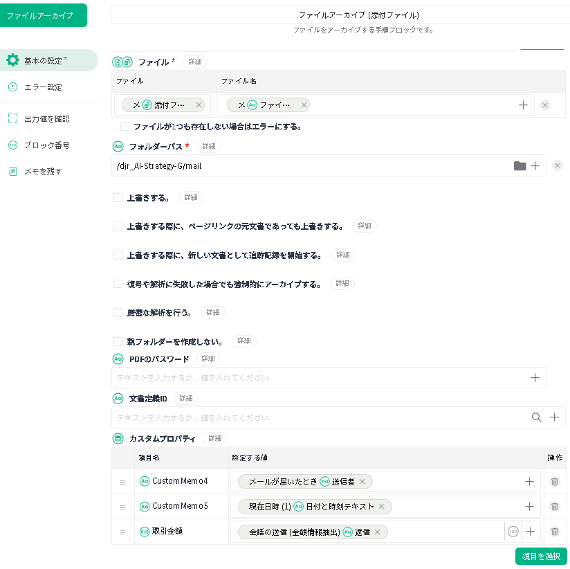 | カスタムプロパティ - 項目名 | 情報を上書きする対象のカスタムプロパティ項目を指定します。 | 今回の例では「取引先」を指定しています。 |