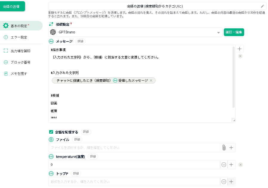 | 接続設定 | 作成済みの生成AI 接続設定を選択します。 | - |