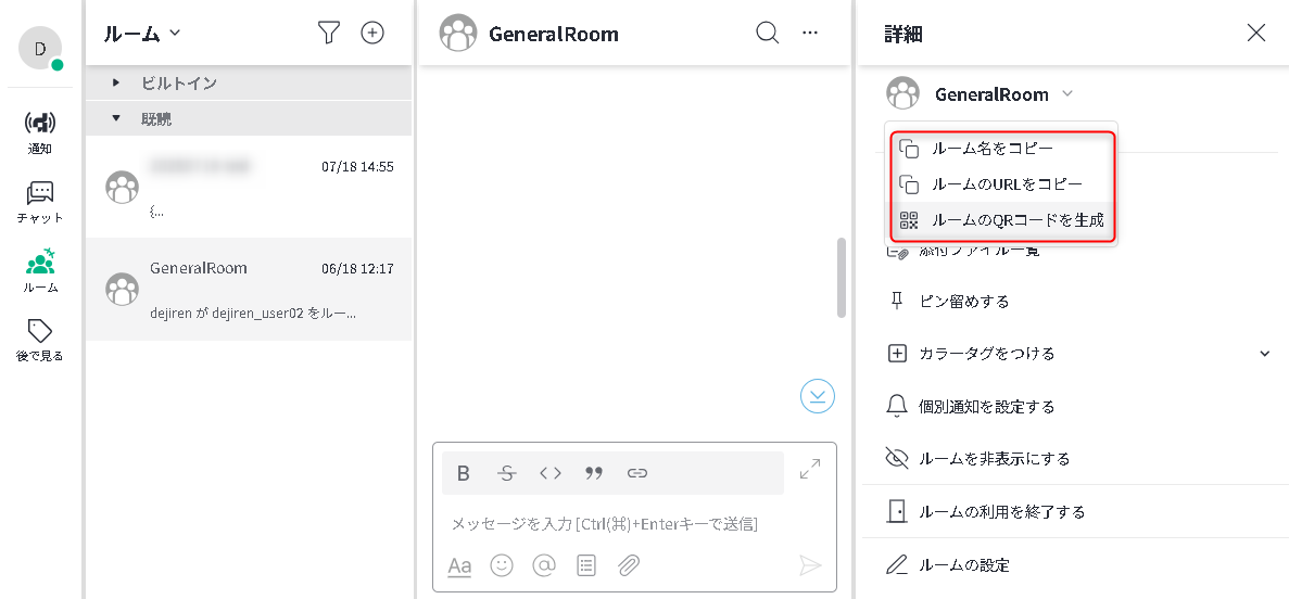 - ルーム名が表示されている箇所の v をクリックすると、ルーム名やルームの URL のコピー、