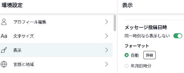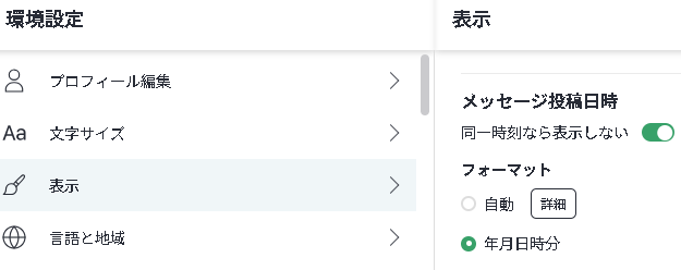 ■「環境設定」> 「表示」でメッセージの投稿日時のフォーマットを変更することができます。