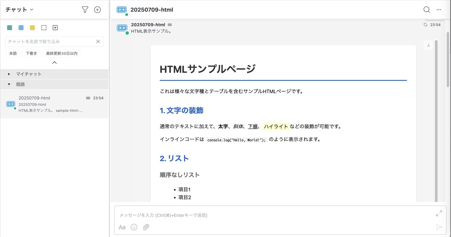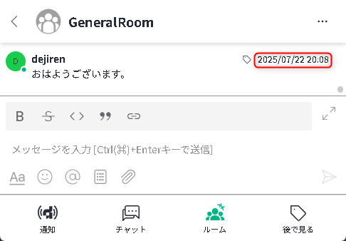 - メッセージは送信日ごとに日付と区切り線を表示して分割します。