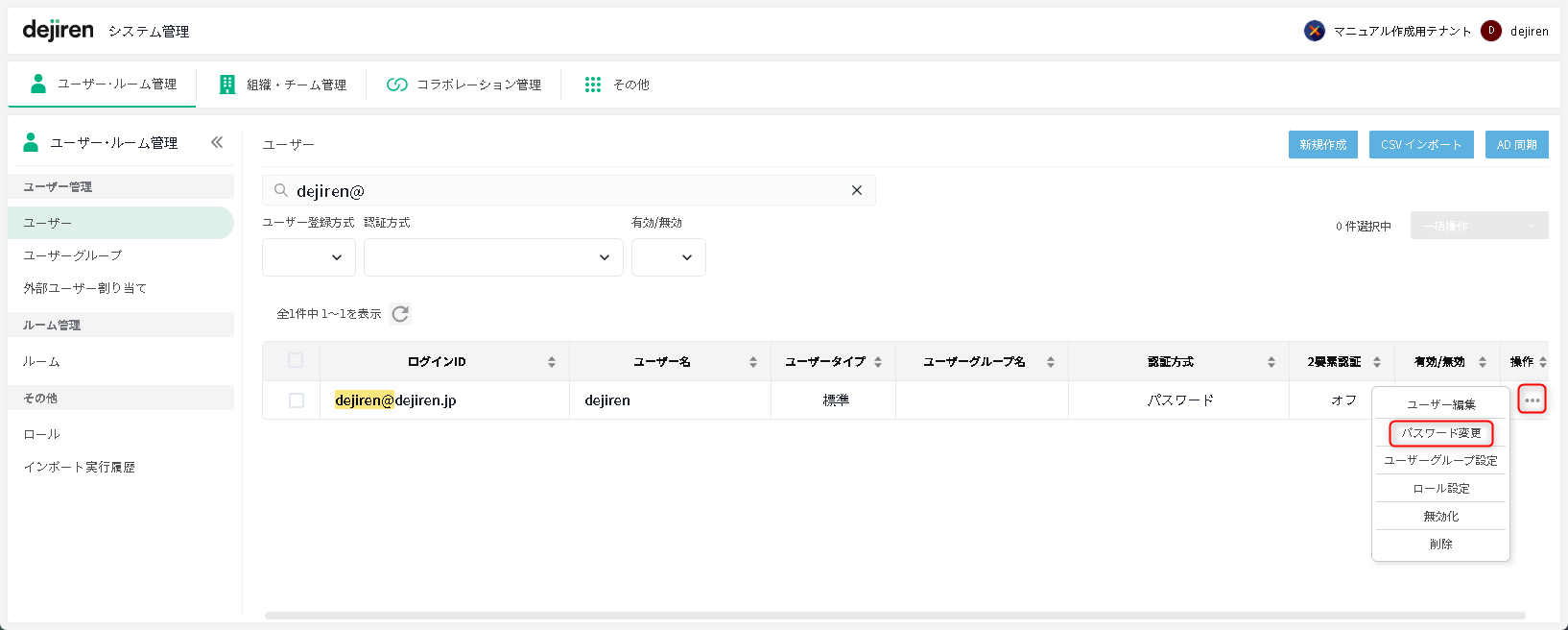 パスワード再設定対象のアカウントの「操作」列にある「…」をクリックして、