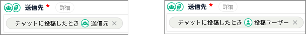 [送信先] として [送信元] を指定されていると、ルームやチャットで VA を呼び出したユーザーに対して VA がメッセージを送信しますが、