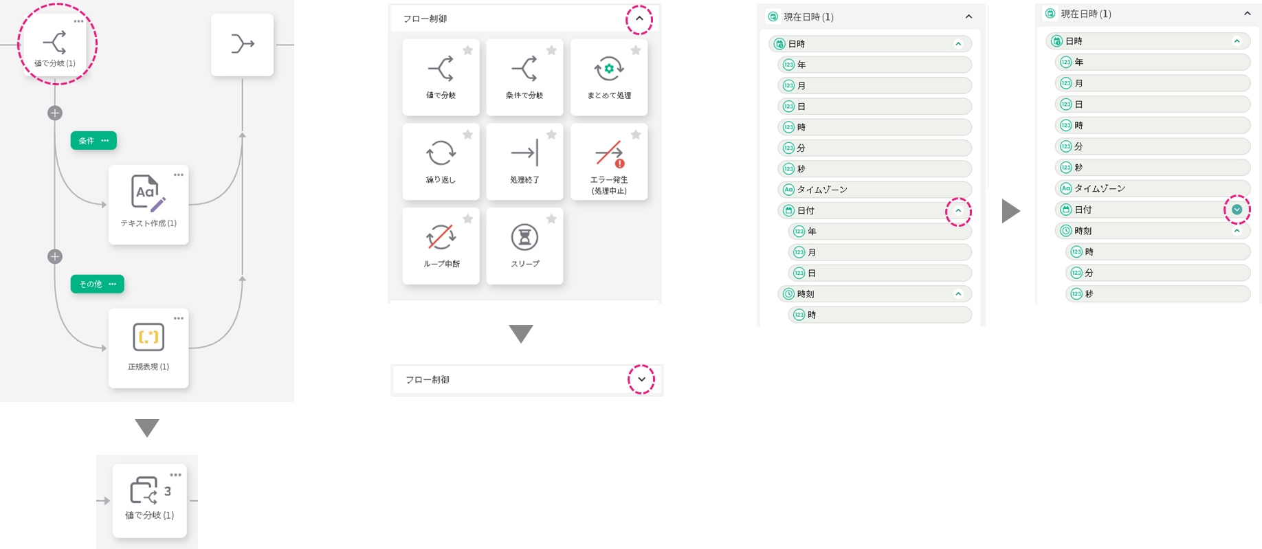 このデータタイプのデータは、[まとめて処理]ブロックを通して使います。