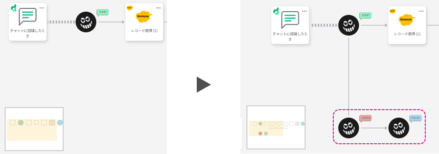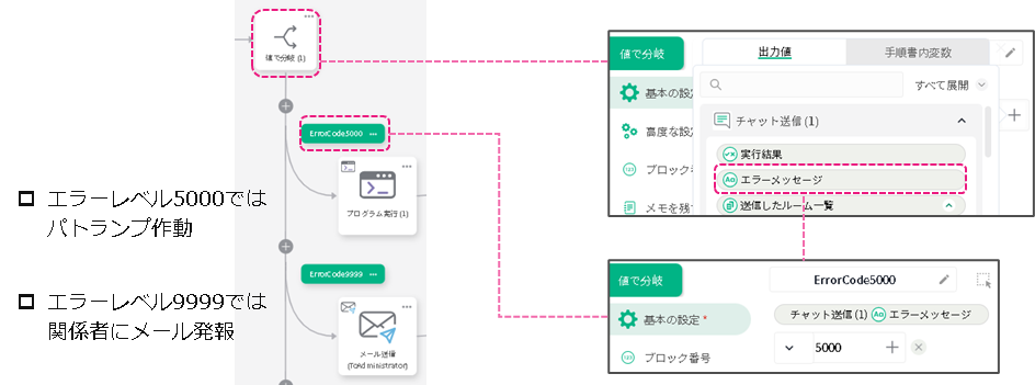 例えば、手順ブロックの実行により発生したエラーのエラーコードにより条件分岐して、別々の処理に進める、といったことが可能です。