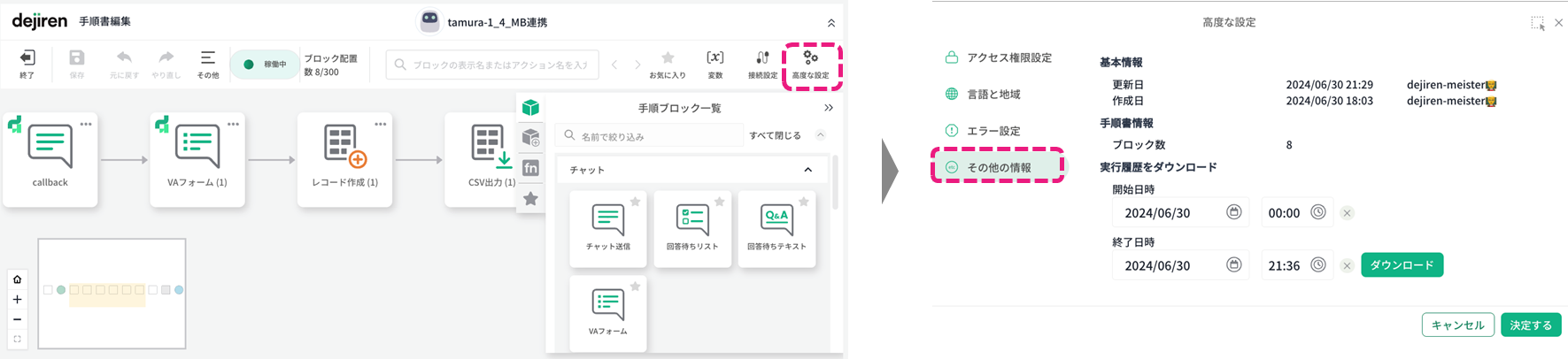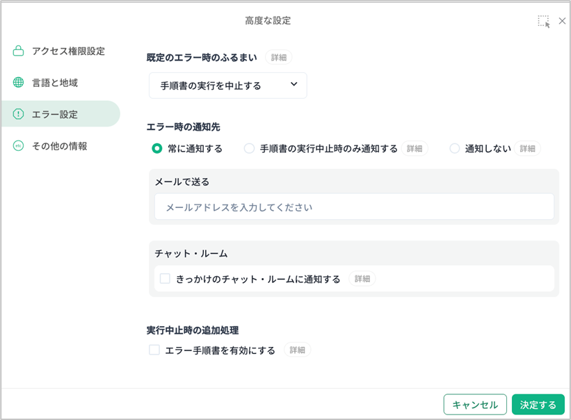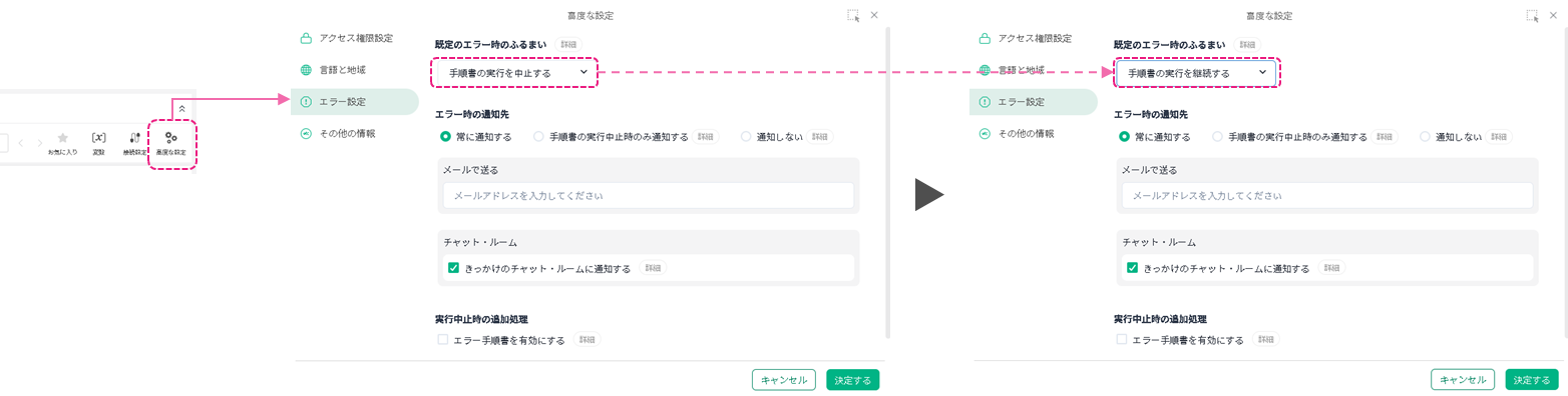 1. 手順書編集画面の[高度な設定]でエラー手順書を有効化