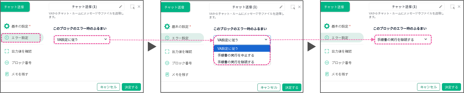 - 個別手順書ブロックの [エラー設定] で [このブロックのエラー時のふるまい] を [VA設定に従う] から任意の動作に変更することが可能です。