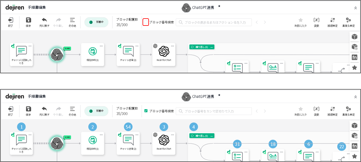d) 手順書編集画面上部にある [ブロック番号検索] にチェックをつけると、ブロックの番号を表示できます。