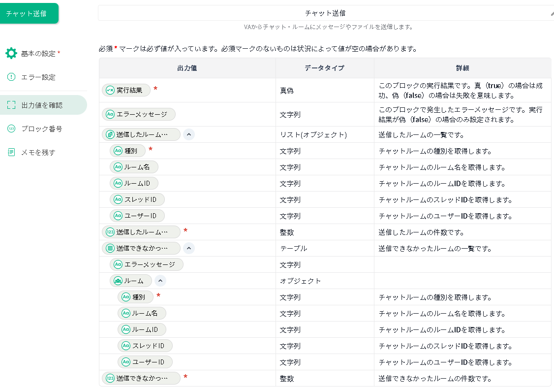 ブロックの実行結果である出力値は、ブロックごとの[出力値を確認]画面で確認できます。