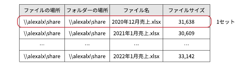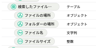 たとえば、「見つかったファイル一覧」という出力値は、見つかったファイルに関連する4つの値(ファイルの場所、フォルダーの場所、ファイル名、ファイルサイズ)を1レコードとし、見つかったファイル数分のレコードで構成されるデータ群です。