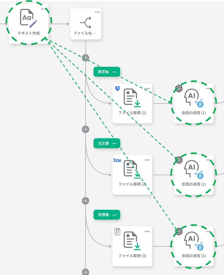 生成AIへの指示プロンプトなど長めの文章については「テキスト作成」ブロックを手順の上流に配置するなどしてご利用ください。
