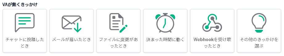VA はチャットなどで呼び出して利用する方法のほか、メール受信や決まった時間に動くように設定することができ、設定 によってはユーザー操作を一切伴わない構成にすることもできます。